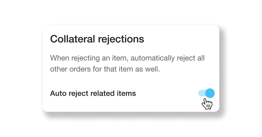 When rejecting an item due to stockouts or other issues, it’s possible that the same item is part of multiple orders. The new Collateral Rejection toggle in the Fulfillment App allows automatic rejection of the same item in all other orders. The scope of this feature depends on if partial rejection is enabled or disabled: