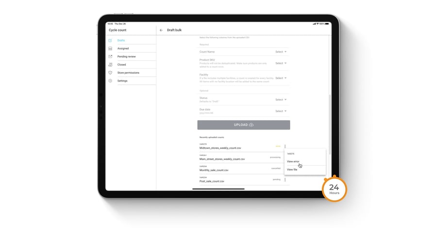 Previously, uploaded CSV files were only accessible for a few minutes after upload. With this update, teams can view uploaded count files for up to 24 hours. The displayed statuses, such as pending, processing, processed, cancelled or error, provide clarity on the current progress of the uploaded file.