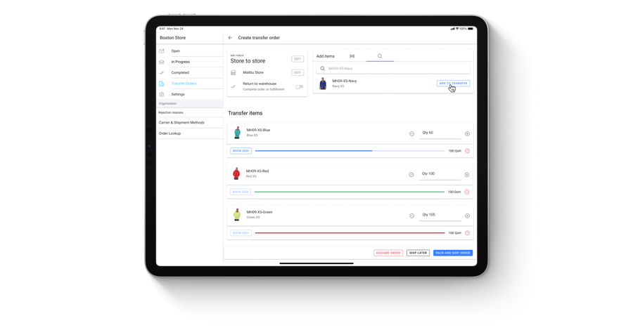 The new flow brings the main actions into a unified view, making it easier for store teams to complete a Transfer Order. Product selection, quantity entry, and shipping all happen in the same place, so associates do not need to switch between different screens while creating and fulfilling a Transfer Order.